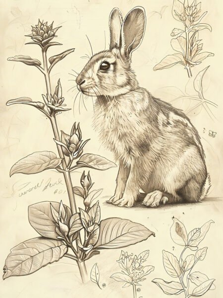 This drawing depicts a hare and several wildflowers in a sketch style. The detailed and vivid illustration conveys a sense of tranquility and nature. It evokes the soft sound of the hare gently hopping on the grass, immersing the viewer in the purity and beauty of the natural world.