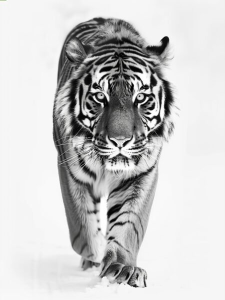 This photo captures a tiger walking through the snow, staring ahead with an aura of majesty and power. The black-and-white tones emphasize the tiger's texture and lines, creating a strong visual impact that conveys its fierce and resilient spirit.