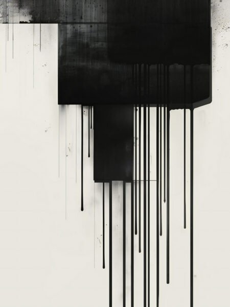 This abstract painting, dominated by black and white tones, showcases the dripping effect of black blocks extending downward from the top of the canvas. Black paint flows from the edges of the blocks, forming vertical lines that suggest a continuous spread of darkness. The blank space on the left contrasts