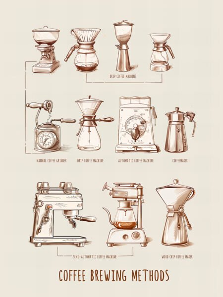 This image showcases various coffee brewing devices, ranging from manual coffee grinders to semi-automatic coffee machines, including drip coffee makers and moka pots. The detailed illustration style makes each device appear lively and interesting, highlighting the diversity and richness of coffee culture.