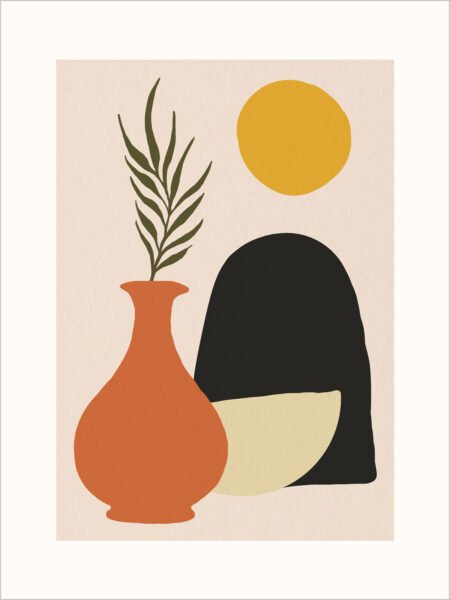 This abstract artwork features simple geometric shapes and soft colors. The main elements are an orange vase, a green plant, and a yellow circle, with black and beige blocks in the background adding depth to the composition. The entire piece exudes a sense of tranquility, warmth, and harmony.