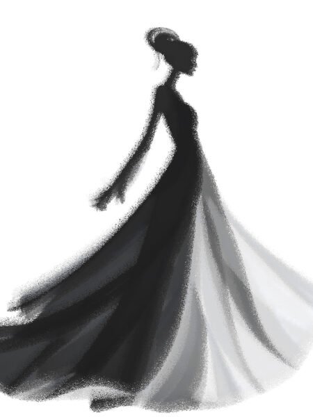 This painting depicts a woman in a black and white gown, gracefully dancing. The combination of simple black-and-white tones and soft brushstrokes creates a dreamy and romantic atmosphere, as if she is dancing through time, embodying elegance and mystery.