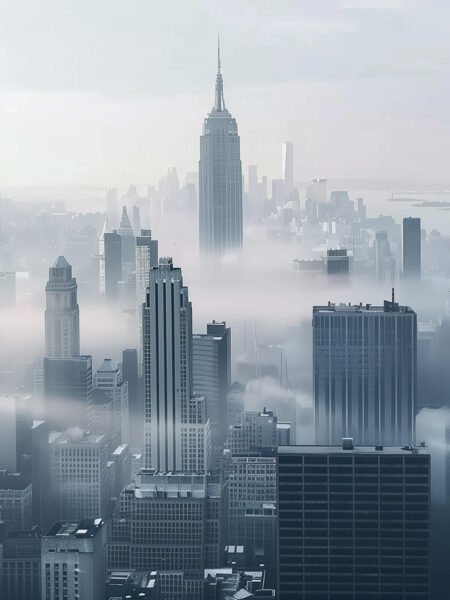 In the fog-covered city skyline, a sense of mystery and tranquility emerges. The towering buildings loom through the mist, sketching the city's contours, evoking the magnificence and allure of modern urban life.