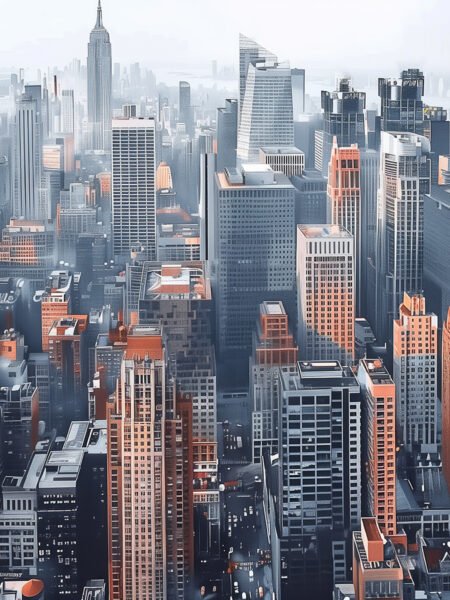 This aerial view captures the vast expanse of an urban landscape, with tightly packed buildings laid out in orderly rows under a grey sky. The city appears like a meticulously functioning machine. The image evokes a sense of calm yet bustling energy, symbolizing the endless drive and vibrancy of city