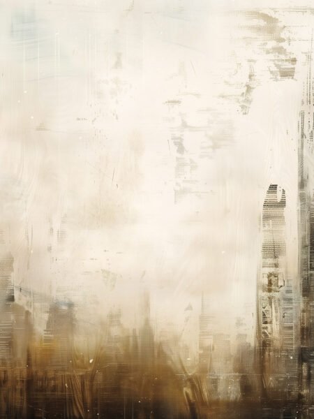 This abstract painting portrays the silhouette of a city shrouded in mist. The artwork employs soft beige and brown tones, creating a hazy, dreamlike atmosphere. The outlines of the buildings are faintly visible, evoking a sense of mystery and tranquility. The overall composition is simple yet layered, transporting the viewer