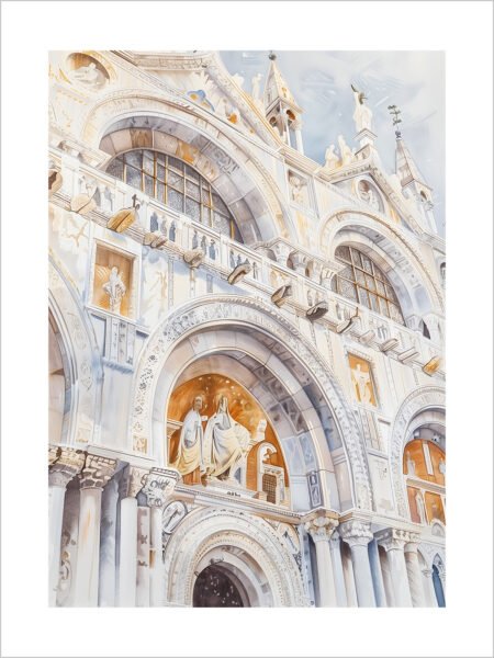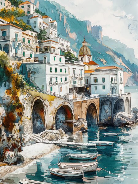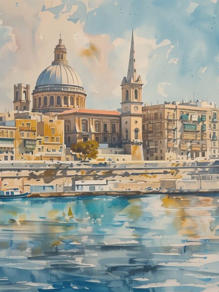 This watercolor painting depicts the beautiful coastal scenery of Malta. The typical Maltese architecture stands out brilliantly under the sunlight. The domed church and spires rise prominently against the city skyline, symbolizing Malta's rich history and culture. The water in the foreground, with its mottled blues and greens, reflects the