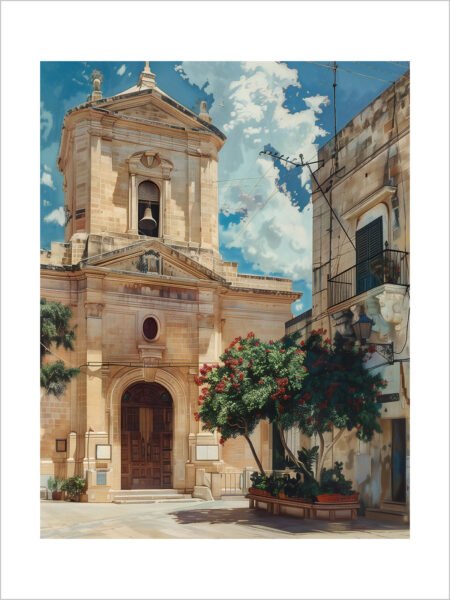 As dusk falls, whitewashed buildings stand quietly beneath the deep blue Maltese sky. Potted plants scatter the square, capturing the tranquility of a Mediterranean evening. The minimalist strokes speak softly of stillness and slow living—a peaceful pause in time.