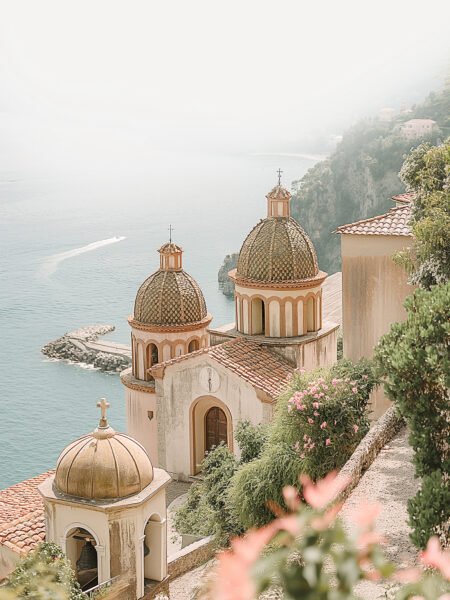 This photo showcases a distinctive classical building by the seashore, featuring light-colored stone and arched windows, exuding elegance. Surrounded by lush greenery, it harmonizes with the serene seascape, while a boat sails in the distance, adding dynamism.