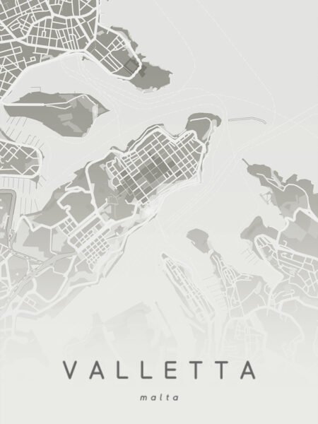 This map displays the detailed streets and harbor layout of Valletta, the capital of Malta, in soft gray tones. The minimalist design makes the map elegant and easy to read, conveying the unique geography and charming atmosphere of this historic city.