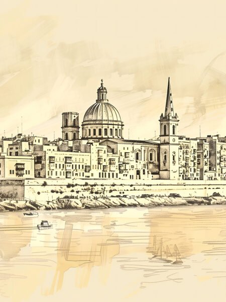 This sketch portrays the classic architectural style of Malta, with prominent spires and domed buildings. The clean lines and detailed depiction make the scene vivid while conveying a sense of historical depth. Through this artwork, viewers can appreciate the unique architectural charm and rich cultural history of Malta.