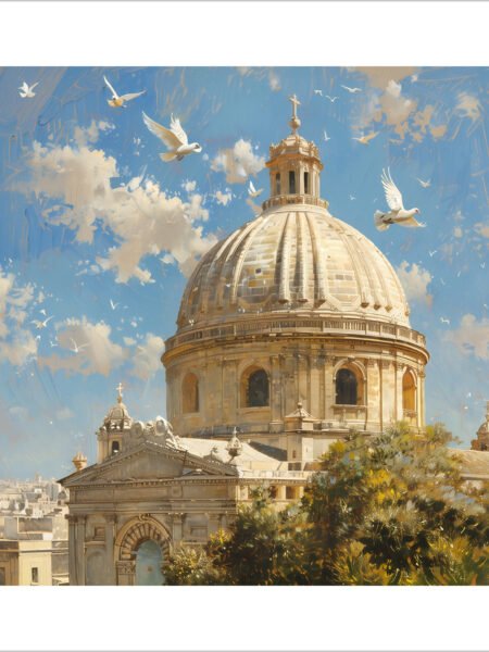 A magnificent domed building stands prominently against a backdrop of blue sky and white clouds, exuding grandeur. Doves soar gracefully in the air, adding a dynamic and peaceful atmosphere to the scene. Trees and greenery in the foreground complement the overall view, with sunlight casting a warm golden glow on