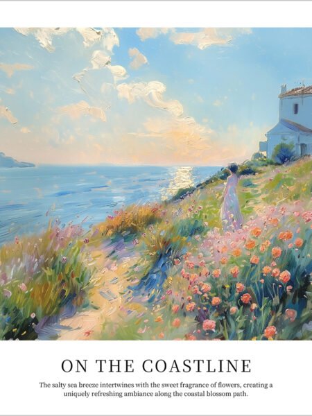 This painting depicts a beautiful coastal scene with a path of blooming flowers stretching towards the distant sea. The sea breeze mingles with the fragrance of flowers, creating a uniquely refreshing atmosphere. The woman in the painting quietly enjoys the serene beauty, evoking a sense of peace and relaxation.