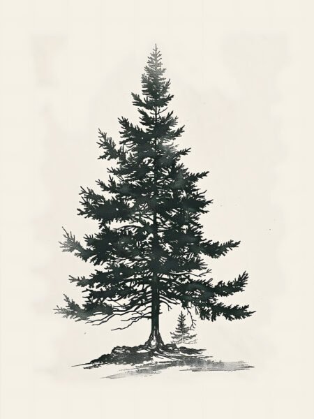 A pine tree stands in the center of the painting, with a straight trunk and lush branches, showing the unique shape of a coniferous tree. The light tones of the background contrast sharply with the pine trees, conveying a simple and tranquil natural beauty as a whole.