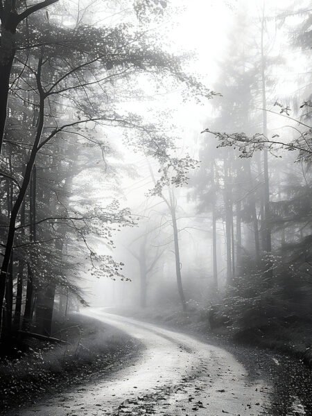 A winding path disappears into the depths of the mist, mysterious and serene. Morning light filters through the branches, creating a dreamy atmosphere. Tall trees stand like guardians on either side, offering a sense of quietness with a touch of mystery. This scene seems to invite you into an unknown