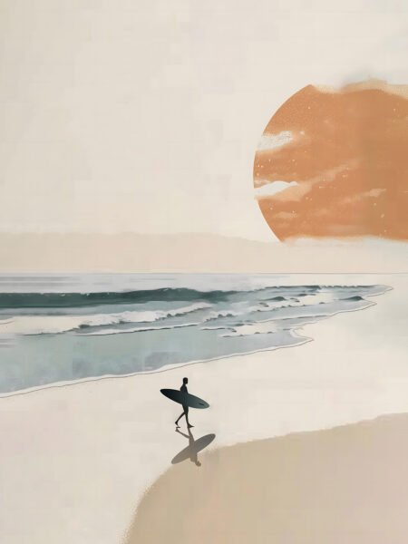 captures a serene scene on the beach, with a surfer in a black wetsuit walking with a surfboard in hand. As the sunset glows, the sky turns a deep orange, and the sea sparkles with ripples. The overall image creates a calming and relaxing atmosphere, uplifting the spirit.