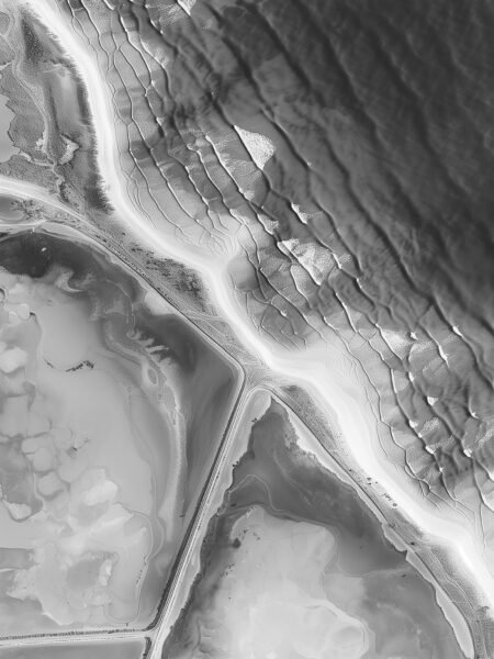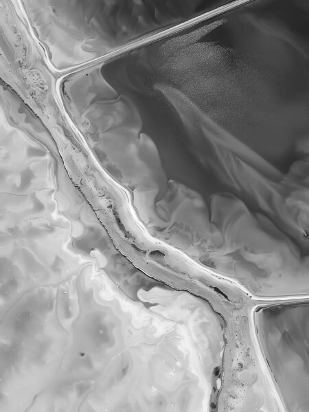 An aerial view reveals the natural textures of the coastline. The black-and-white tones enhance the contrast, making the layers of the beach and waves more pronounced. The curves of the coastline and the textures of the water create an abstract natural painting, showcasing the unique beauty of nature. The piece