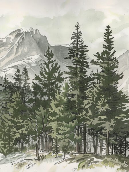 This painting depicts a dense pine forest with towering mountains in the background and a few antelopes strolling through the woods. The scene is filled with tranquility and natural harmony, giving a sense of peace away from the hustle and bustle.