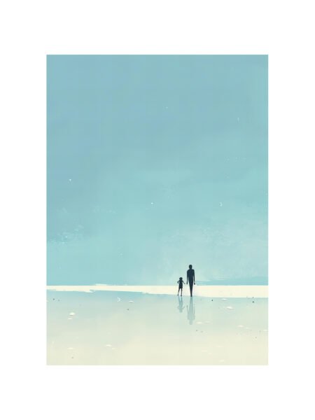 This painting depicts an adult and a child walking along the beach, with a vast sky and a serene sea in the background. The soft tones and minimalist style evoke a sense of calm and warmth, as if the world is reduced to this intimate pair, sharing a quiet moment