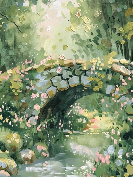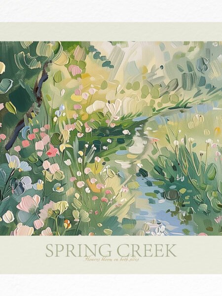 This artwork depicts a vibrant spring scene with a stream gently flowing through a flower-filled meadow. Pink, white, and green blossoms bloom profusely, complementing the soft blue-green waters of the stream. The entire composition radiates peace and harmony, as if one can hear the murmur of the stream and feel