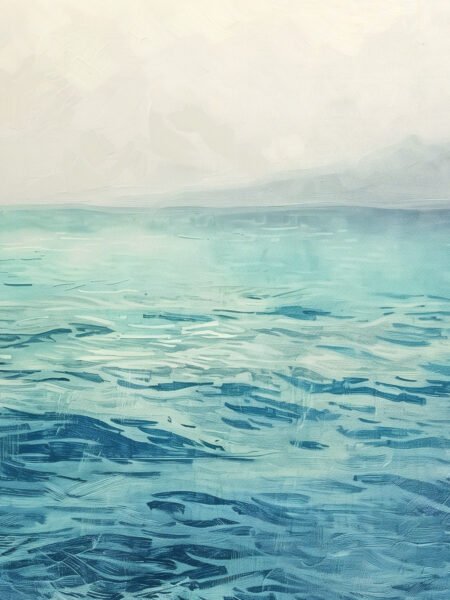 This painting captures a serene ocean, with the water displaying layers of blue and green hues, gently rippling in the breeze. The distant horizon blends seamlessly with the sky, creating a sense of tranquility and vastness. The delicate and soft colors and brushstrokes make one feel as if they are