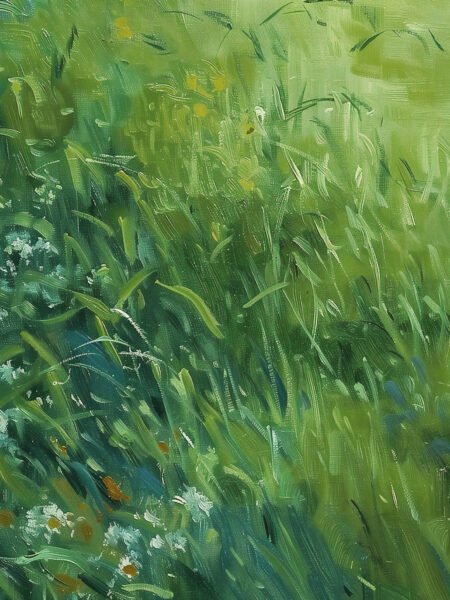 This painting depicts a lush green meadow, dotted with sporadic white flowers, evoking a sense of natural freshness. The rich green hues and delicate brushstrokes portray the gentle swaying of the grass in the breeze, almost letting you smell the fragrance of the meadow. The overall tone of the painting