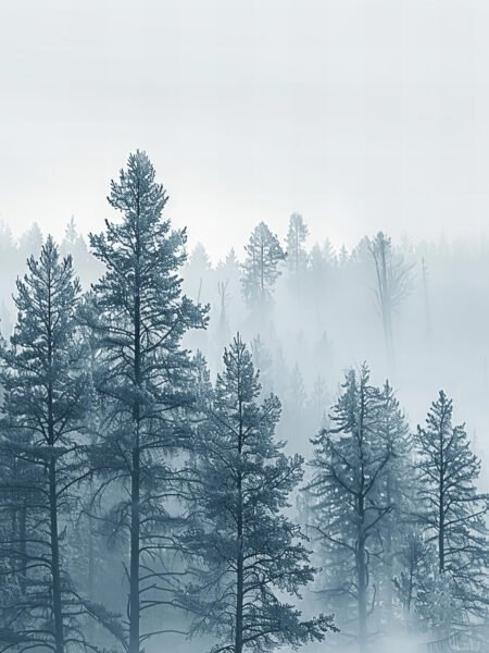 This image depicts a forest shrouded in thick mist, with trees covered in snow, creating a scene that resembles a snowy wonderland. The fog drifts among the trees, evoking a sense of mystery and tranquility, allowing one to feel the purity and calmness of nature.
