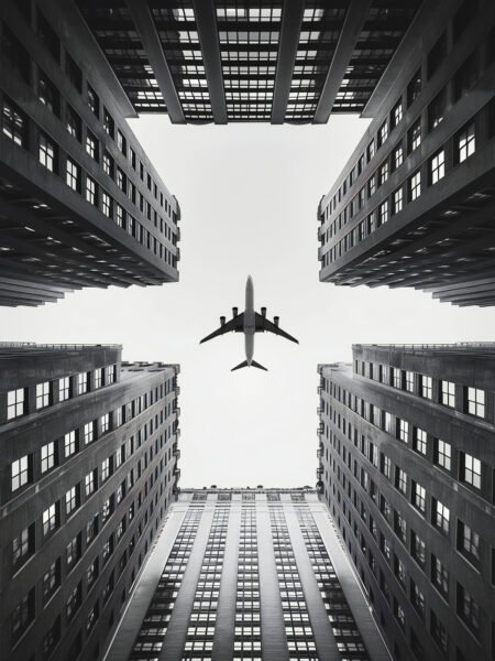 This black-and-white image of an airplane flying through city skyscrapers evokes a strong modern urban rhythm. The interplay between the plane and the buildings creates a dynamic and tense scene, showcasing the bustle and vitality of the city.
