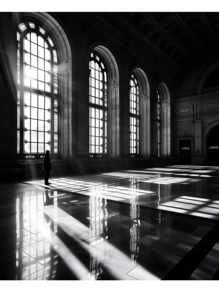 The black-and-white photo shows a spacious interior clad in marble, with arched windows dividing the space and letting in soft light. On the left, a person stands quietly from behind, seeming to be deep in thought. The whole scene is quiet and solemn, full of tranquility and profound atmosphere.