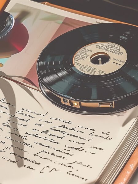 The image features a vinyl record and an open handwritten notebook, bathed in sunlight, creating a warm and serene atmosphere. The gleam of the record contrasts with the handwritten notes, evoking a deep sense of nostalgia for music and writing, as if telling a heartfelt story of music and creativity.
