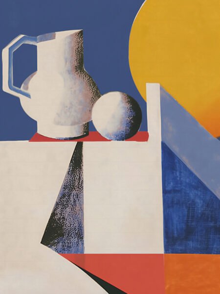 This painting showcases a set of still objects through geometric shapes and bright colors. The background features a contrast of deep blue and yellow, with a white jug and sphere in the foreground, placed on a red plane. The composition is simple and modern, evoking a sense of tranquility and