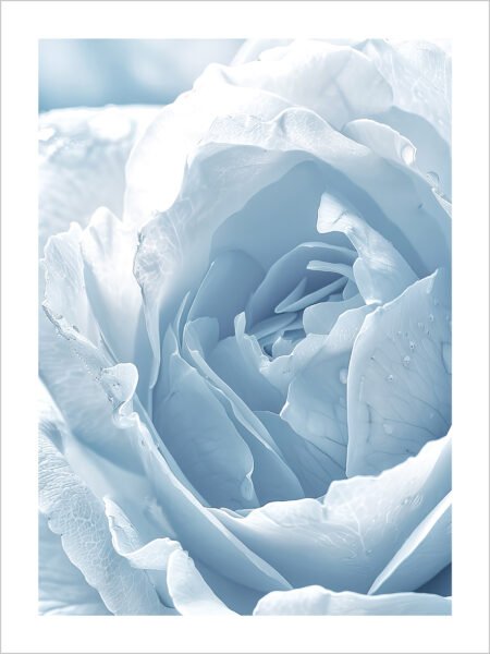 This image showcases an ice-blue rose adorned with dew drops on its petals. The icy blue tones give the rose a calm and pure beauty, as if it is blooming in winter, evoking a sense of tranquility and freshness.