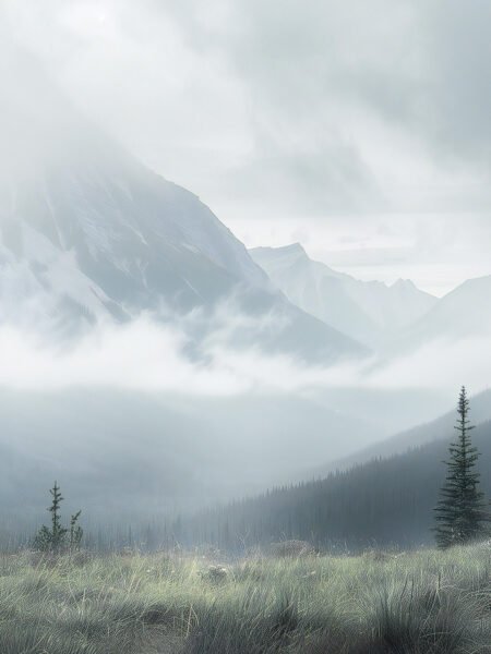 This image captures a valley enveloped in dense fog, with mists swirling around the mountains, creating a mysterious and serene atmosphere. The distant peaks emerge subtly, adding grandeur to the scene. The image evokes feelings of tranquility, peace, and endless possibilities.