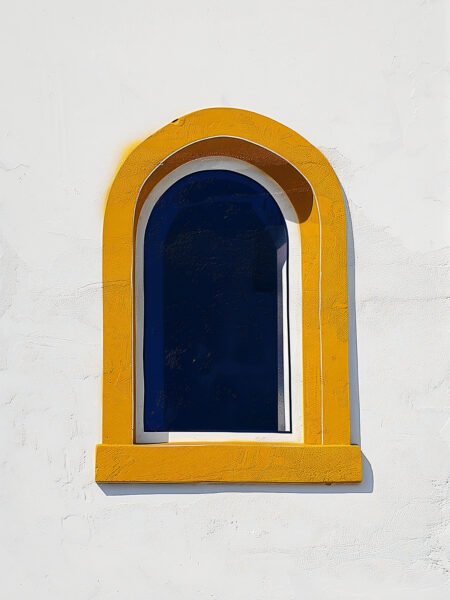 This photograph features a window with a yellow frame, set against a snow-white wall, with a deep blue interior. The simple color combination makes the image appear bright and clean, while the contrast between yellow and blue is both striking and harmonious. The arched design of the window adds a