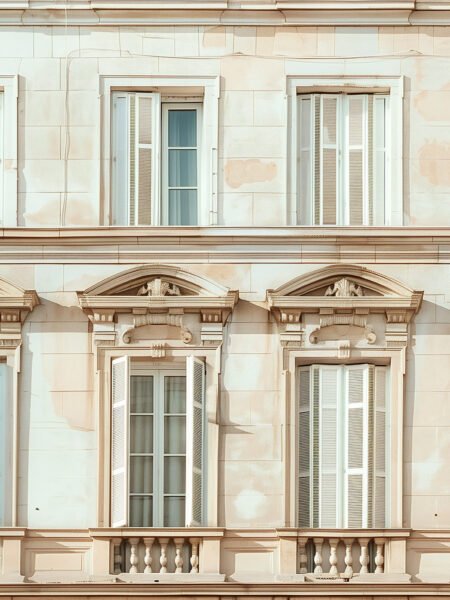 This photograph showcases the beautiful windows of a building facade, each adorned with intricate decorations and symmetrical design. The white shutters complement the soft beige walls, creating a classic and elegant atmosphere. The detailed carvings above the windows highlight the exquisite craftsmanship of the architecture. The overall image is simple
