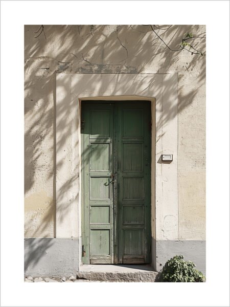 This image features an old green wooden door, with the shadows of leaves cast on the wall in front. The weathered door and the aged wall reflect a sense of history and tranquility. The overall scene evokes a feeling of calm and nostalgia, as if leading one back to a