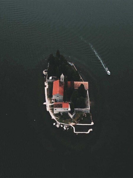 This image showcases a solitary island, viewed from above, making it appear as if it's floating on the deep waters. The structures on the island exude tranquility and solitude, while the surrounding dark waters add a sense of mystery and calm, as if time has stopped here.