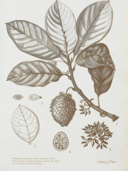 This image shows a detailed illustration of a tropical plant, including sketches of the leaves, fruit, seeds, and the entire plant. This scientific illustration precisely captures the plant's structure and features, providing a sense of the fusion between scientific study and natural aesthetics.