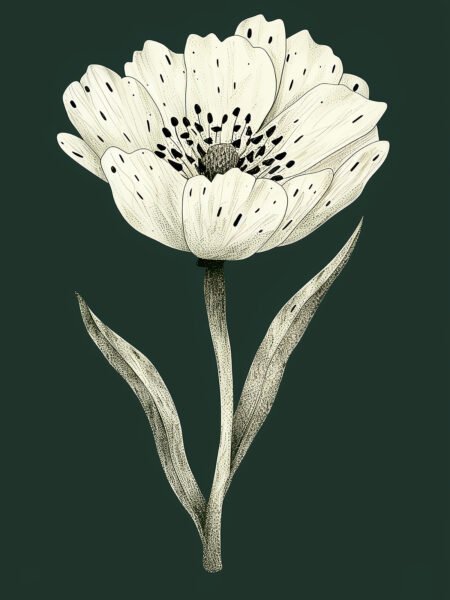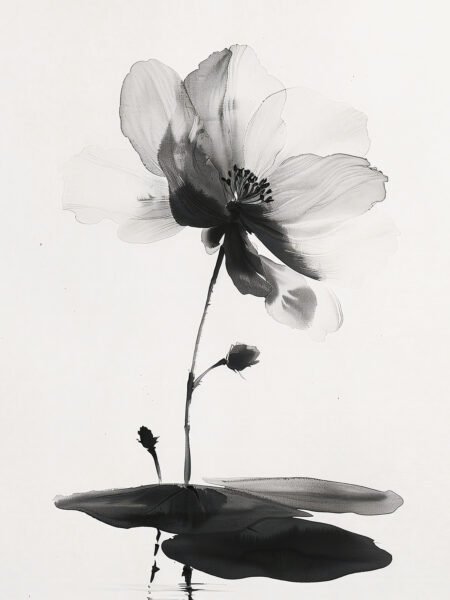 This artwork, rendered in a black and white ink style, depicts a graceful flower with delicate petals that seem to sway gently in the breeze. The piece evokes a sense of tranquility and subtle elegance, revealing a profound beauty that captures a fleeting moment in time with timeless grace.