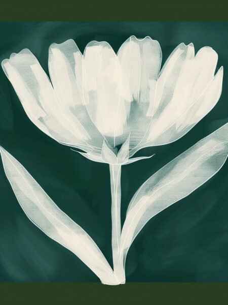 "Moonlit Bloom" depicts a pristine white flower against a deep green background, as if bathed in gentle moonlight. Delicate strokes highlight the texture and lines of the petals, enhancing the purity and elegance of the flower. The simple color palette and clear contours create a tranquil and harmonious atmosphere, evoking