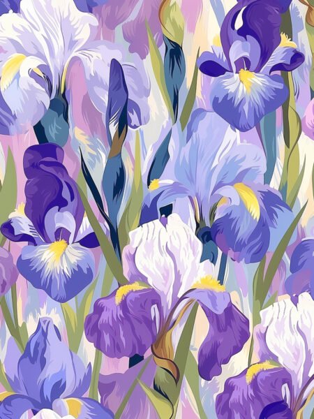 This painting is filled with layers of vibrant purple and blue irises, creating a colorful and lively scene. The overlapping flowers evoke the feeling of being in a dreamy sea of blooms. These blossoms convey a sense of tranquility and elegance, providing a refreshing and pleasing visual experience.