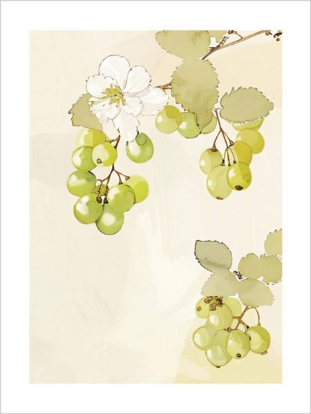 This painting depicts several clusters of green grapes alongside a white flower, using soft tones and a watercolor style. The overall impression is one of tranquility and harmony, evoking a sense of nature and freshness, as if standing in a summer vineyard enjoying the gentle breeze.