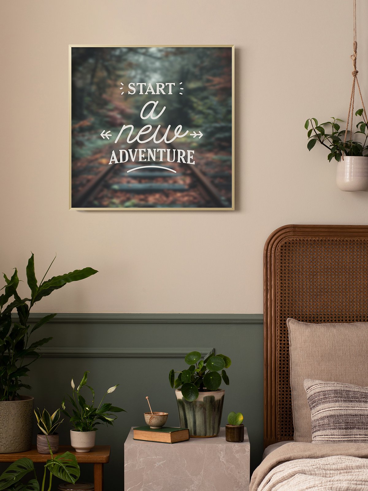This image features a blurred forest track with the words «Start a New Adventure» prominently displayed in the foreground. The scene evokes a sense of mystery and anticipation, encouraging people to step out of their comfort zones and embrace the unknown adventures ahead.