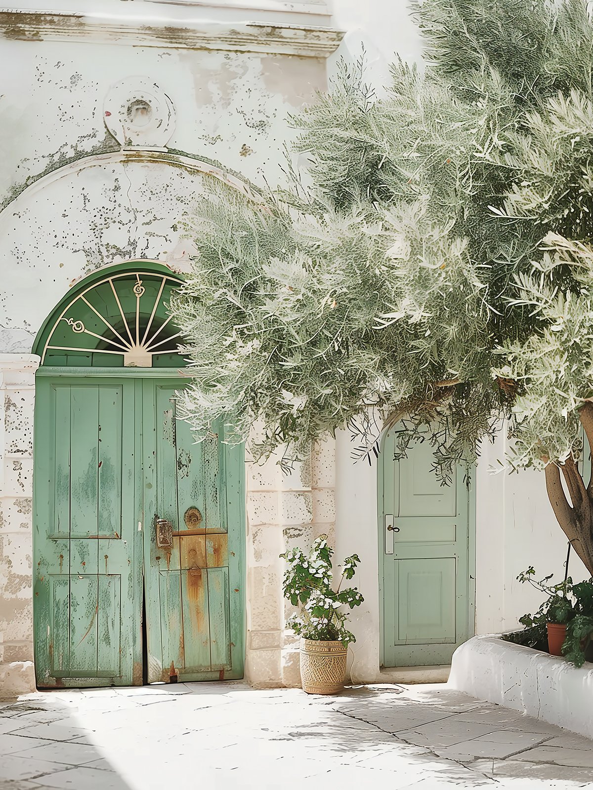 This photograph showcases a tranquil courtyard bathed in afternoon sunlight, highlighting an ancient green door and a lush olive tree. The weathered walls and rusty iron gate reveal traces of time, while the potted plants in front add a touch of vitality to the scene. The entire image exudes a serene and leisurely atmosphere, making one feel the gentle breeze and the fragrance of flowers and plants. This scene depicts a peaceful corner away from the hustle and bustle, filled with the harmony of history and nature.