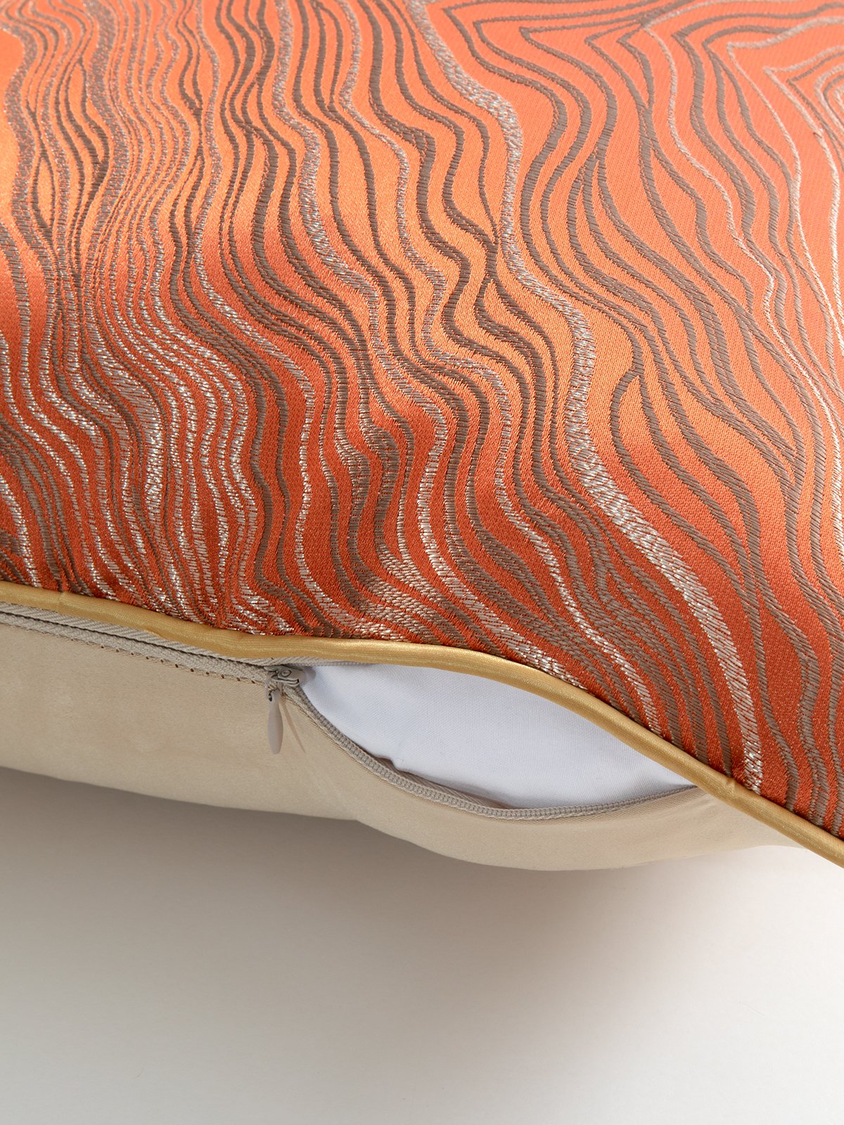 Made of jacquard weaving, gilt lines, and a bright orange ripple pattern, gold and silver threads are embedded in it, giving it a gorgeous luster. It is paired with decorative piping details to make the cushion cover more refined as a whole. With hidden zipper, easy to remove and wash.