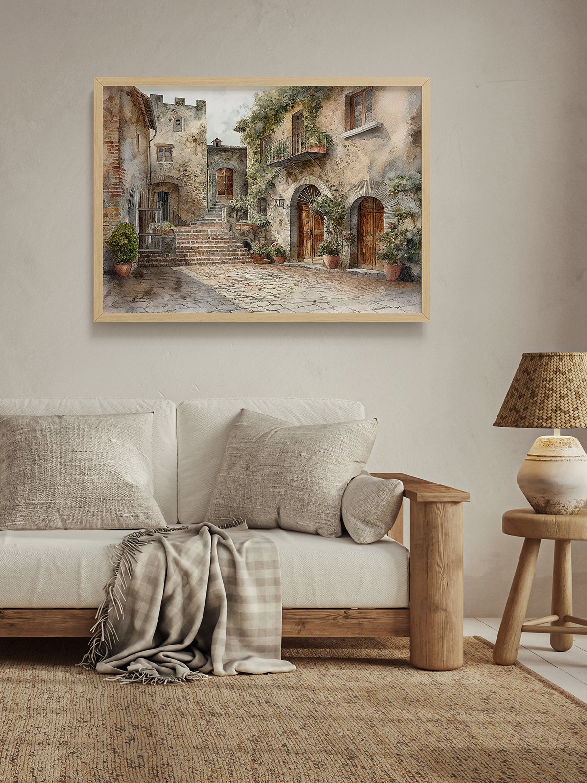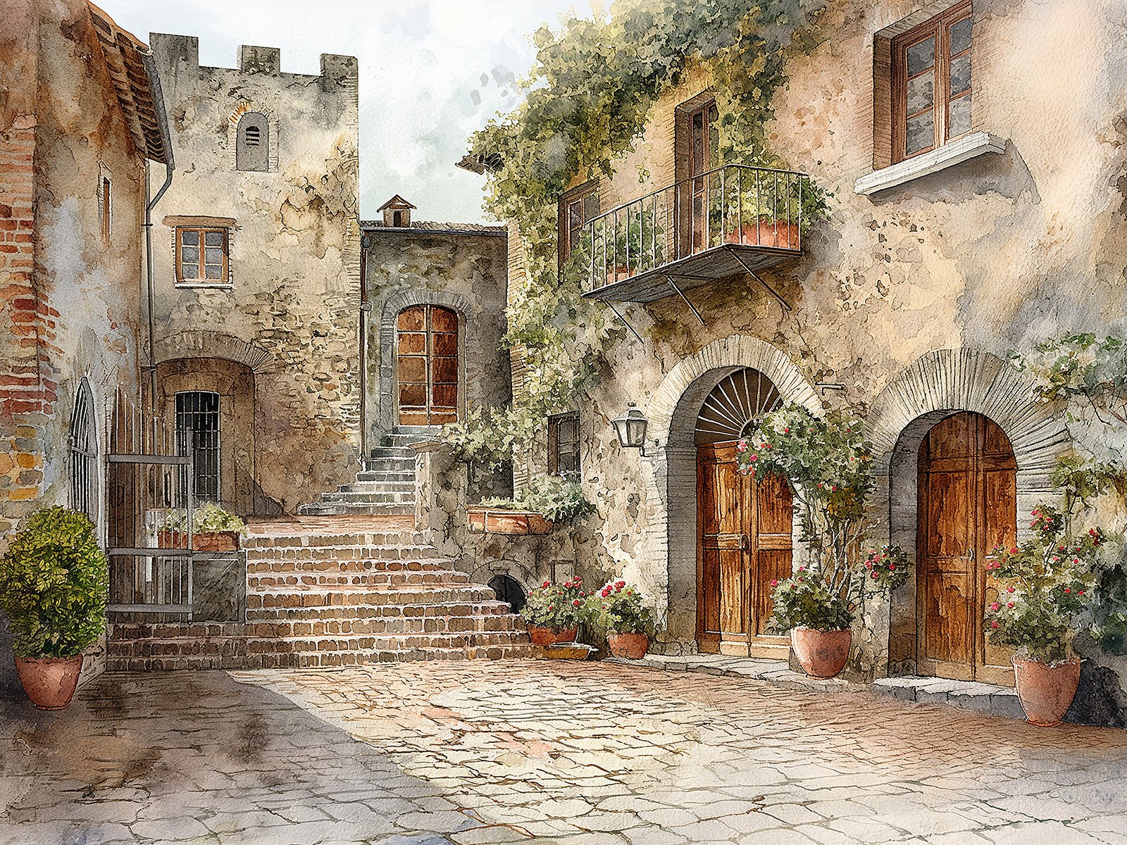 Painting shows an ancient street with lush stone buildings. Pots of flowers add life, soft colors evoke history. Serene and harmonious, time flows gently.
