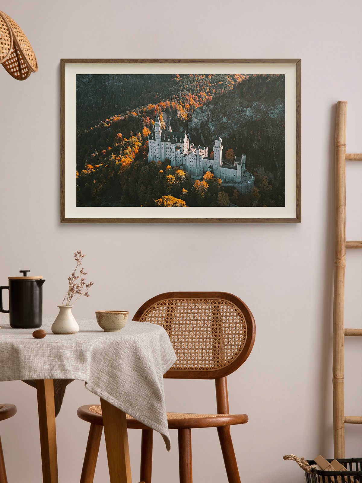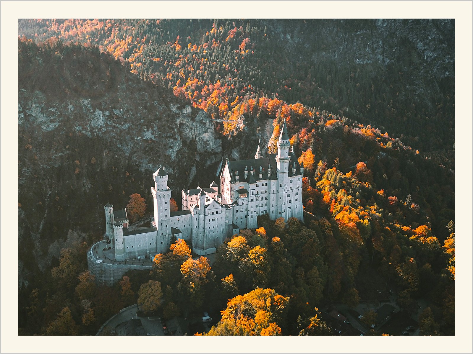This image features a white castle nestled in a forest during late autumn, surrounded by trees ablaze with golden and orange hues. The castle stands majestically in the mountains, with sunlight casting a warm glow on its walls, creating a mysterious and romantic atmosphere, as if leading one into a fairytale world.