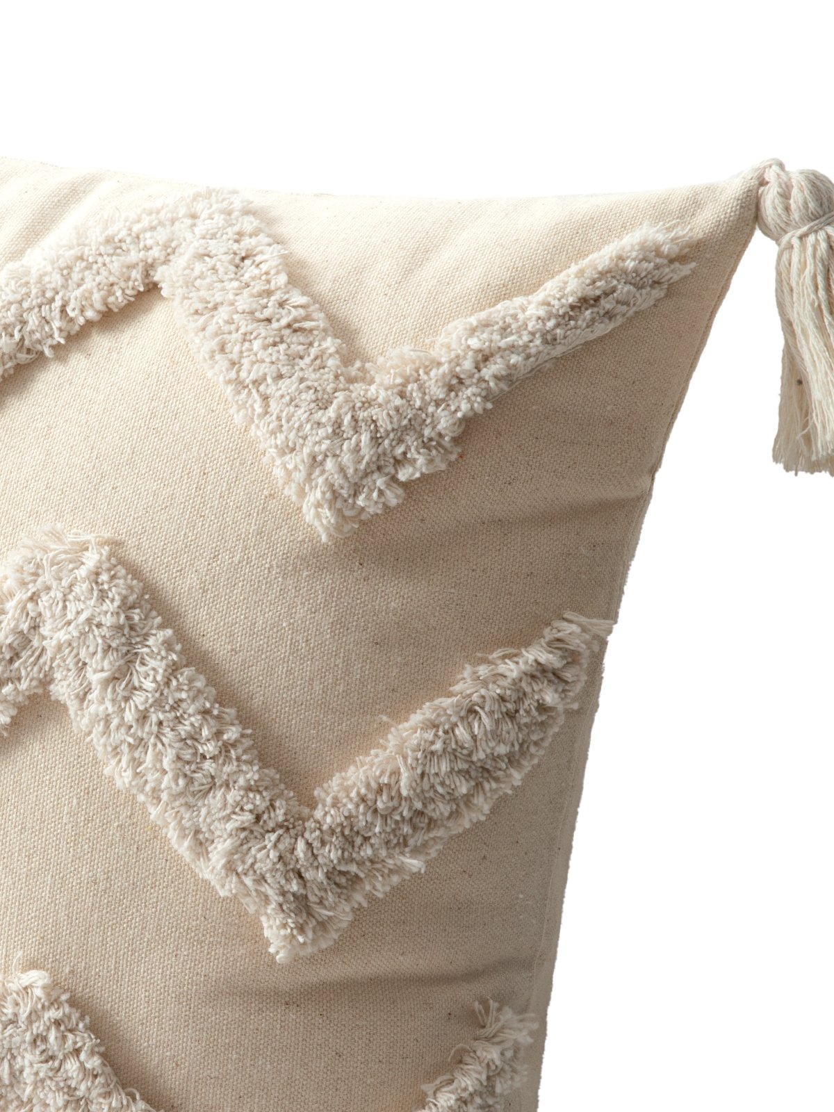 The strong bohemian style brings a free and romantic atmosphere to the home environment. Use soft beige tones to create a rustic and warm home atmosphere. The geometric patterns of straight lines and broken lines are embroidered with creative hoops to give a more three-dimensional concave and convex feel. The tufting process neutralizes the slightly rough feel of the canvas fabric. Featuring lively tassels on the sides. Concealed zipper, easy to remove and wash.