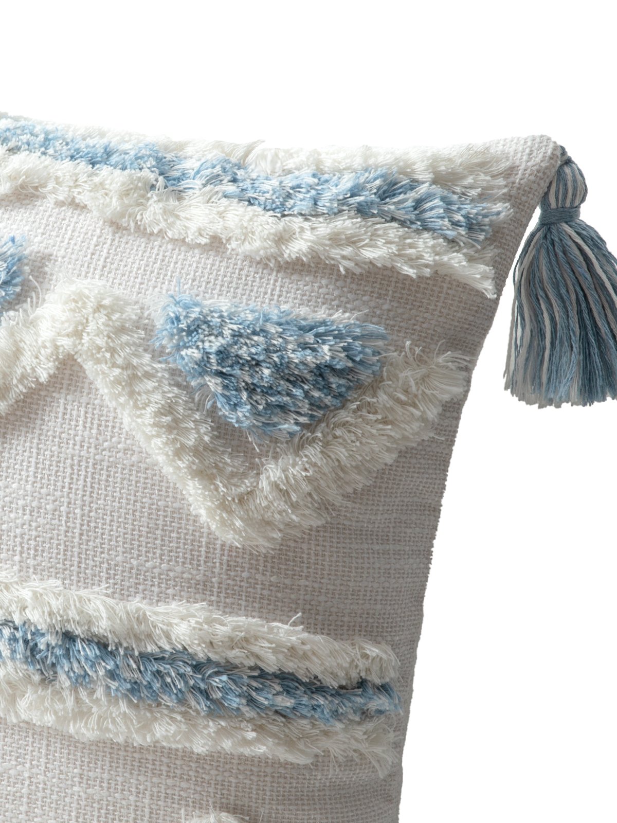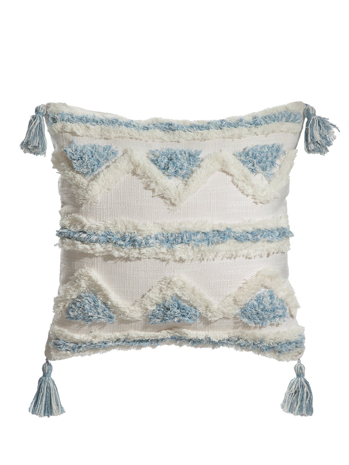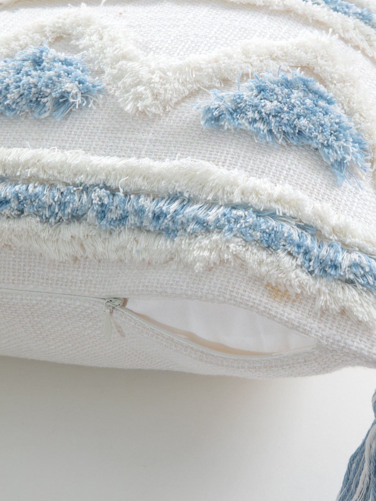The strong bohemian style brings a free and romantic atmosphere to the home environment. The blue and white color scheme makes people feel relaxed and comfortable. The geometric pattern adopts creative circle embroidery, which makes it more three-dimensional and concave. The tufting process neutralizes the slightly rough feel of the canvas fabric. Featuring lively tassels on the sides. Concealed zipper, easy to remove and wash.