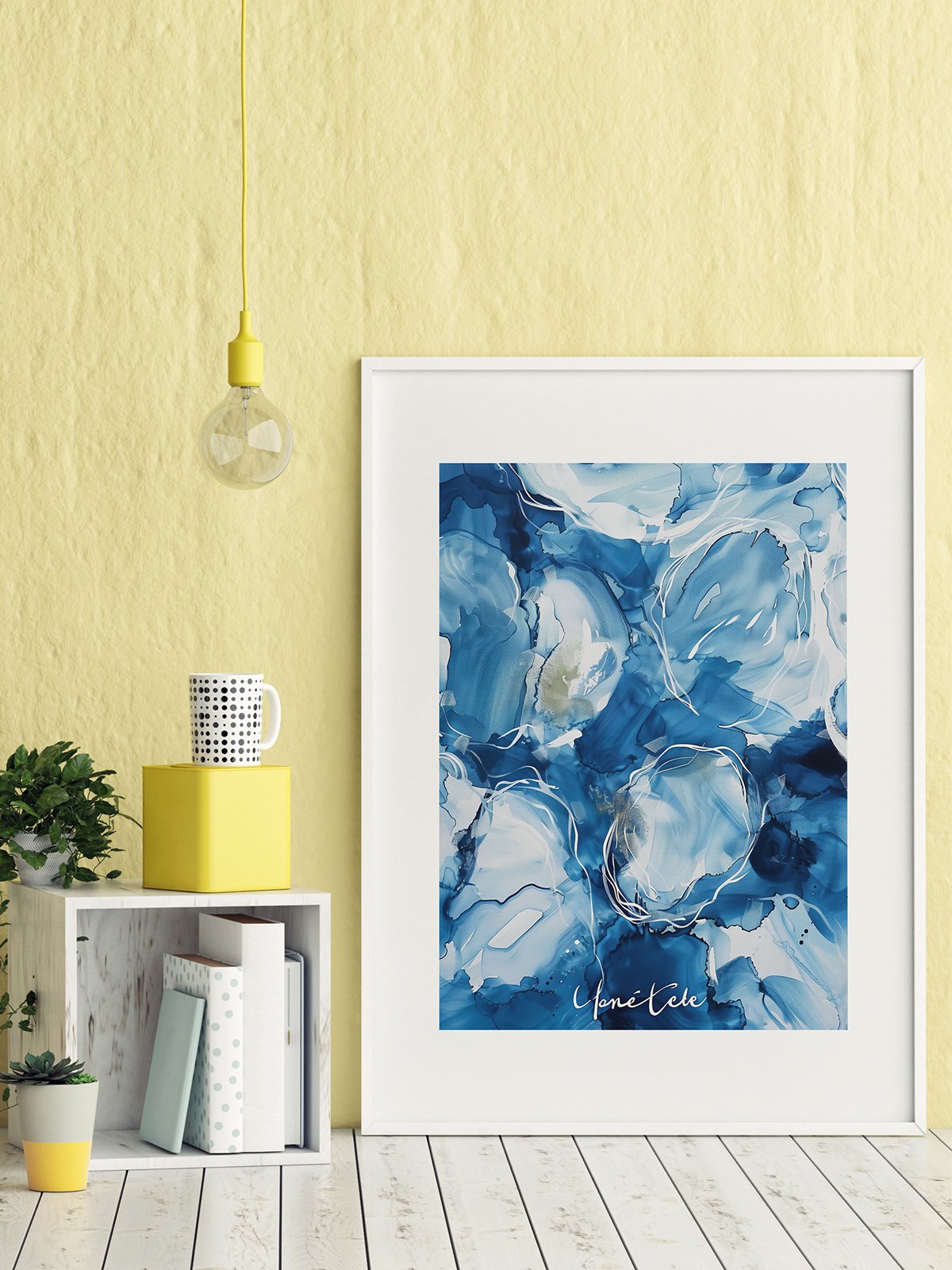This abstract painting features shades of blue and white, depicting a dreamy, fluid scene. The swirling colors and lines evoke the movement of ocean waves, imparting a sense of tranquility and depth. The overall image is filled with a sense of fluidity and freedom, allowing viewers to experience a serene and relaxing immersion in a blue dreamscape.