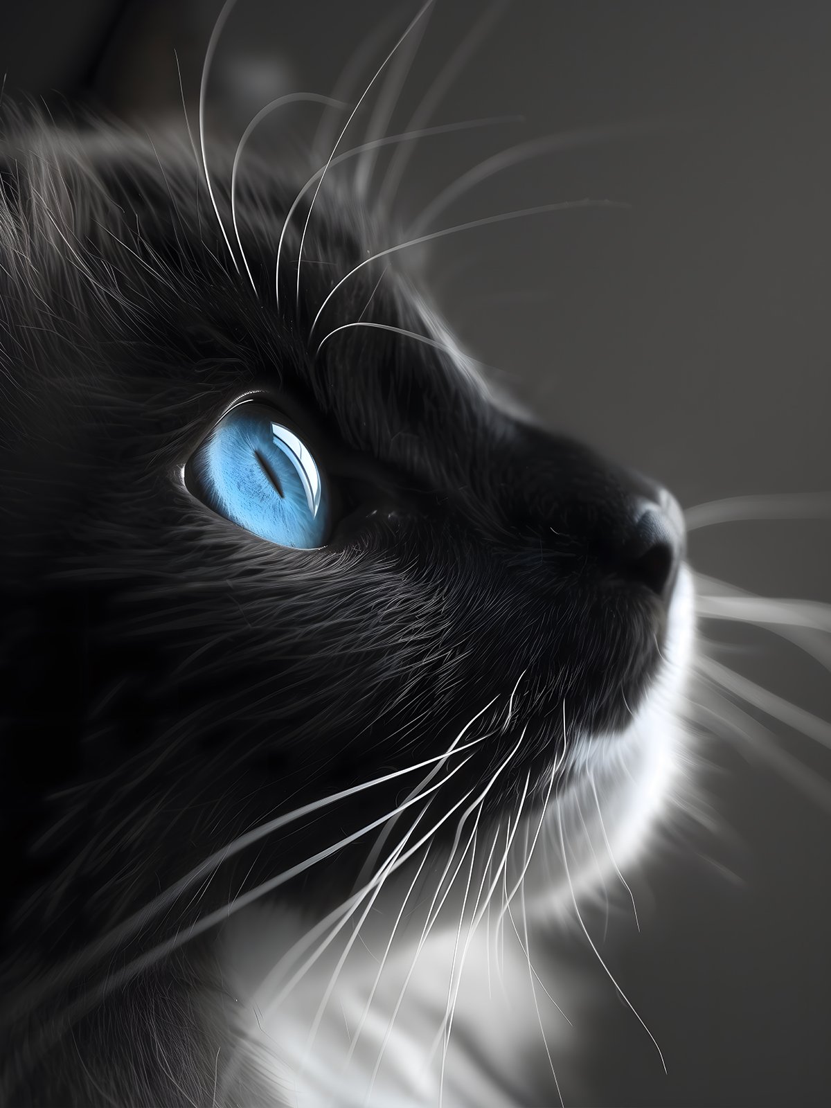 The scene focuses on a close-up of a cat. This cat has a pair of extremely eye-catching blue eyes, bright and clear, like two crystal sapphires, which stand out against the dim background. The overall picture is full of mystery and tranquility, making people want to explore the inner world of this cat more deeply.